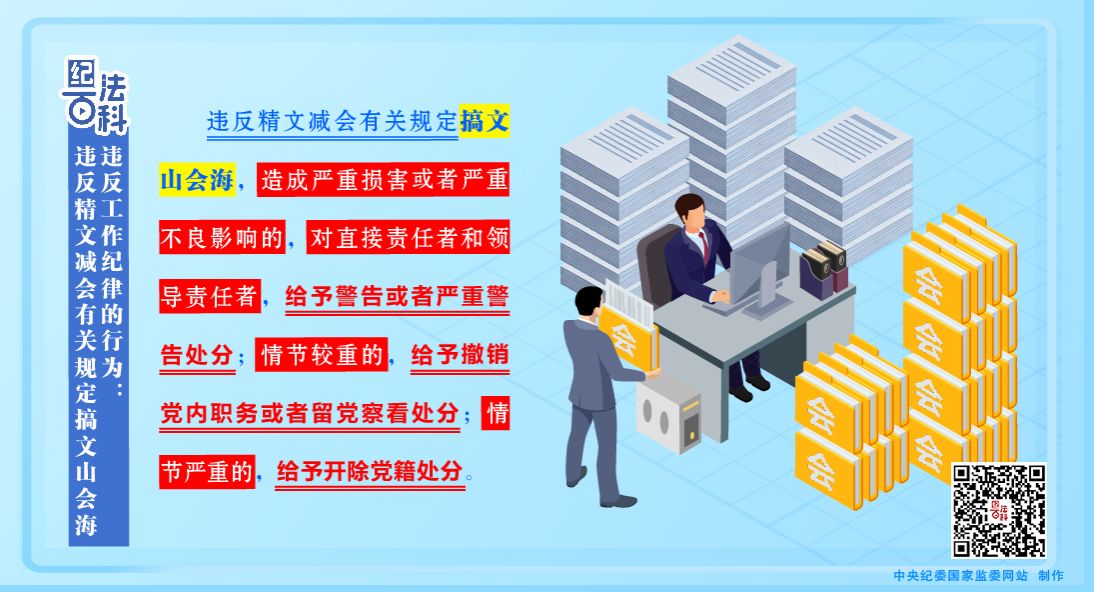 2023年12月修订印发的《中国共产党纪律处分条例》将“违反精文减会有关规定搞文山会海”行为纳入处分范围,规定违反精文减会有关规定搞文山会海,造成严重损害或者严重不良影响的,对直接责任者和领导责任者,给予警告或者严重警告处分;情节较重的,给予撤销党内职务或者留党察看处分;情节严重的,给予开除党籍处分。